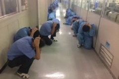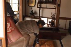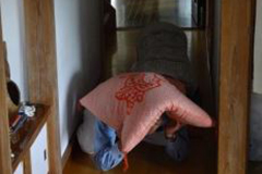 外に面した窓から離れるため廊下に出て、身を守る姿勢をとる。