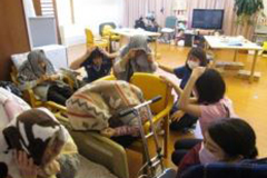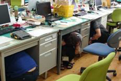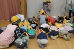 防災頭巾やヘルメットをかぶり、窓から離れて、身を守る姿勢をとる。