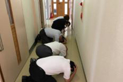 教室から窓のない廊下に出て、身を守る姿勢をとる。