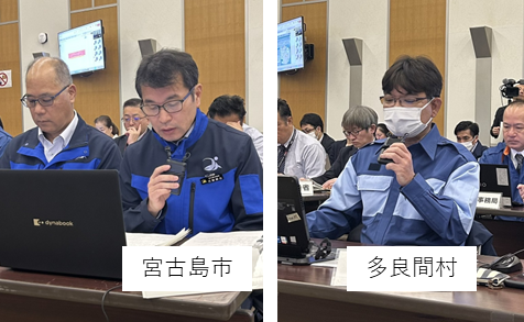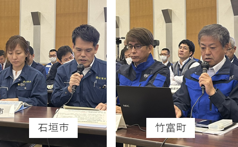 沖縄県、市町村(石垣市、宮古島市、多良間村、竹富町、与那国町)、内閣官房、内閣府、警察庁、総務省、消防庁、外務省、文部科学省、厚生労働省、農林水産省、国土交通省、海上保安庁、環境省、第十一管区海上保安本部、防衛省、沖縄防衛局、沖縄県警察、指定(地方)公共機関、自衛隊等(そのほかオンライン参加機関を含む)
